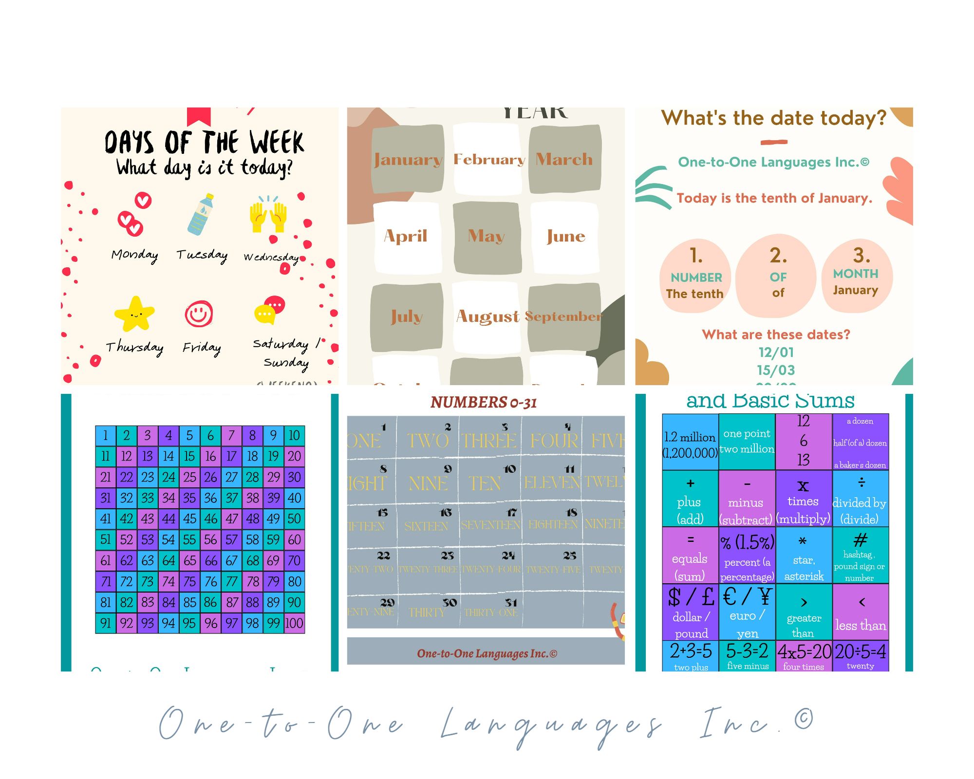 - Teacher resources - Alphabet & Pronunciation - Days, months, numbers, date - Colours - Greetings